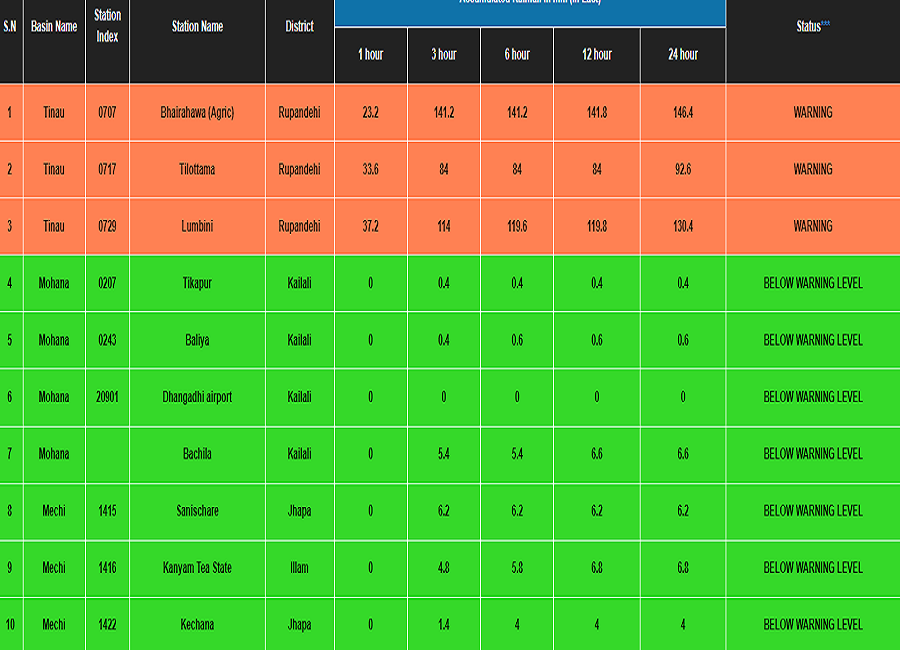 जल तथा मौसम विज्ञान विभागको बाढी पूर्वानुमान शाखाका अनुसार पछिल्लो तीन घण्टामा भैरहवामा १४१.२ मिलिमिटर, तिलोत्तमामा ८४ मिलिमिटर, लुम्बिनीमा ११४ मिलिमिटर मापन गरिएको छ । यी क्षेत्रका तिनाउ नदीमा पानीको बहाव मापन गर्नका लागि यन्त्रहरु लगाइएको छ ।