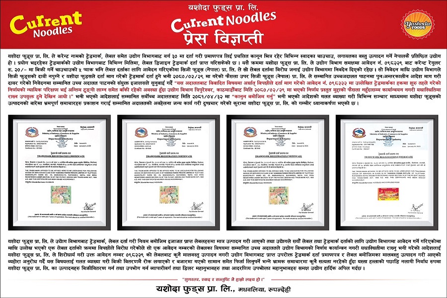 ‘यशोदा फुड्स प्रालि करेन्ट नामको ट्रेडमार्क, लेबल समेत उद्योग विभागबाट वर्ग ३० मा दर्ता गरी प्रमाणपत्र लिइ प्रचलित कानूनभित्र रहेर विभिन्न स्वादका चाउचाउ लगायतका वस्तुहरु उत्पादन गर्ने नेपालकै प्रतिष्ठित उद्योग हो । प्रयोग भइरहेका ट्रेडमार्कको उद्योग विभागबाट विभिन्न मितिमा लेबल डिजाइन ट्रेडमार्क दर्ता गरिसकेको छ’, विज्ञप्तीमा भनिएको छ ।