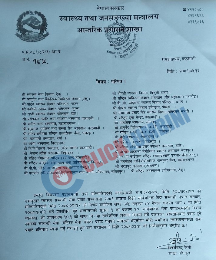 ‘‘ सार्वजनिक बिदाका दिनमा सबै प्रकारका अस्पतालबाट प्रवाह हुने स्वास्थ्यसम्बन्धी सेवा (बहिरंग सेवा समेत) प्रवाह गर्नुपर्ने व्यवस्था भएकामा सोही बमोजिम स्वास्थ्य सेवा प्रवाह अनिवार्य रुपमा गर्नु गराउनुहुन यस मन्त्रालयको मिति २०८१र०५र१६ को निर्णय अनुसार अनुरोध छ’, स्वास्थ्य मन्त्रालयद्धारा जारी परिपत्रमा उल्लेख छ ।