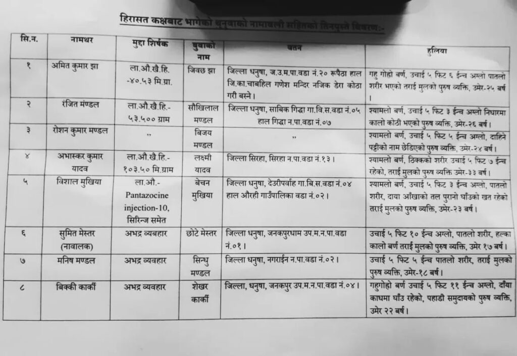जिल्ला प्रहरी कार्यालय धनुषाका प्रवक्ता डिएसपी रञ्जन अवाका अनुसार फरार हुनेमा लागुऔषध मुद्दाका अमितकुमार झा, रंजित मण्डल, रोशनकुमार मण्डल, अभास्कर कुमार यादव, विशाल मुखिया र अभद्र व्यवहारमा पक्राउ परेका मनिष मण्डल र बिक्की कार्कीका साथै एक जना नाबालक रहेका छन्।