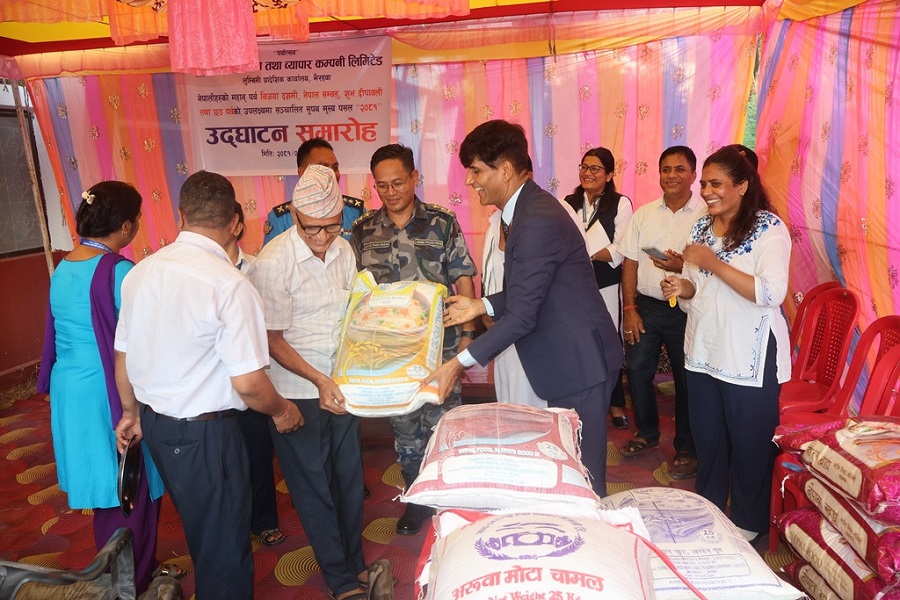 रुपन्देहीका प्रमुख जिल्ला अधिकारी गणेश अर्यालले उपभोक्ता बाबुराम घिमिरेलाई चामल हस्तान्तरण गर्दै उक्त पसलको उद्घाटन गरे।