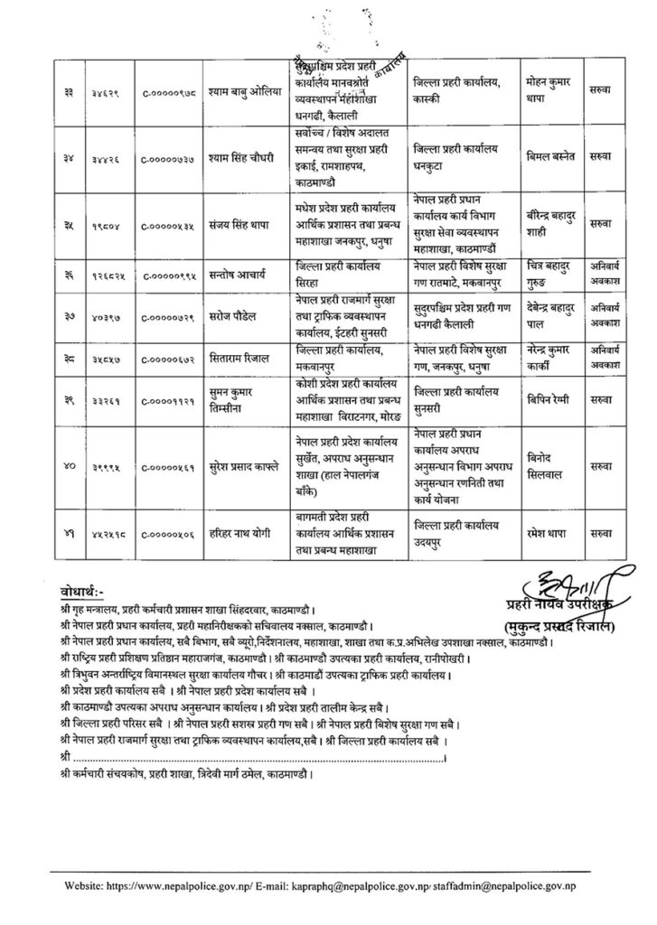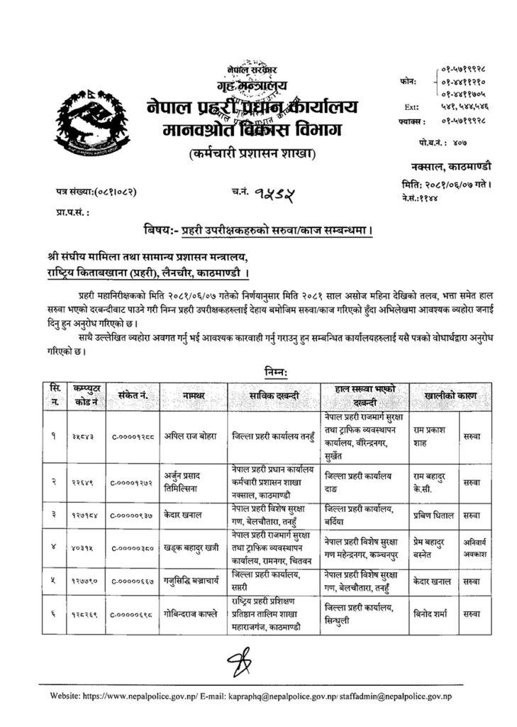 मंगलबार साँझ निकालिएको सरुवामा जिल्ला प्रहरी कार्यालयका एसपी अपिल राज बोहरालाई नेपाल प्रहरी राजमार्ग सुरक्षा तथा ट्राफिक व्यवस्थापन कार्यालय सुर्खेत सरुवा गरिएको छ । त्यस्तै जिल्ला प्रहरी कार्यालय कास्कीको एसपीमा श्यामबाबु ओलियालाई पठाइएको छ भने जिल्ला प्रहरी परिसर ललितपुरमा नवरत्न पौडेल, दाङमा अर्जुन प्रसाद तिमिल्सिना, मकवानपुरमा विश्वराम खड्का, सुनसरीमा सुमनकुमार तिमल्सिनाको सरुवा गरिएको छ।