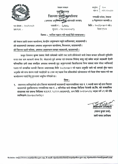 पत्रमा भनिएको छ-‘प्रस्तुत विश्वमा कृष्णप्रसाद जैसी समेतको जाहेरी तथा प्रहरी प्रतिवेदनले वादी नेपाल सरकार प्रतिवादी सूर्यदर्शन बचत तथा ऋण सहकारी संस्था लि. पोखराको पूर्वअध्यक्ष एवं सञ्चालक गितेन्द्रबाबु राई समेत भएको सहकारी ऐनले परिभाषित ठगी तथा संगठित अपराधसम्बन्धी मुद्दा अनुसन्धानको सिलसिलामा पक्राउ गर्न सम्मानित कास्की जिल्ला अदालतबाट पक्राउ अनुमति जारी भई आएको हुँदा पक्राउ अनुमति यसै साथ संलग्न राखी पठाईएको छ प्राप्त भए पश्चात निज प्रतिवादीको खोजतलास गरी फेला परेमा पक्राउ गरी यस कार्यालयमा पठाइ दिनु हुन सादर अनुरोध गरिएको छ।’
