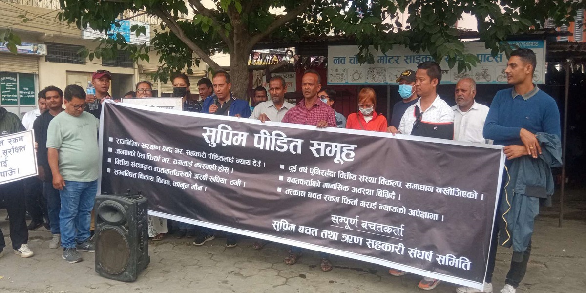 सुप्रिम सहकारी पीडित समूहको नामको ब्यानरसहित उनीहरुले आफुहरुलाई न्याय दिनुपर्ने मागसहित प्रदर्शन गरेका छन् । मंगलबार नयाँ सडकमा जम्मा भएका पीडितहरुले जिल्ला अदालत प्रवेश गर्ने चोकमा जम्मा भएर आफुहरुले न्याय पाउनुपर्ने माग गरे । राजनीतिक संरक्षणमा कसैलाई उन्मुक्ति दिन नहुने उनीहरुको माग छ ।