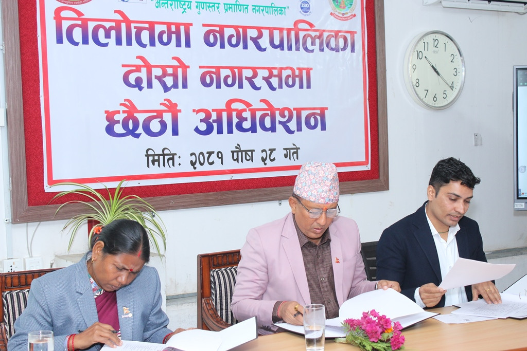 भैरहवा,२९ पुस । रुपन्देहीको तिलोत्तमा नगरपालिकाको दोस्रो नगरसभाको छैठौं अधिवेशनको विभिन्न प्रस्तावका ऐन पारित गर्दै सम्पन्न भएको छ । नगरप्रमुख रामकृष्ण खाणको अध्यक्षतामा भएको बैठकले नगरपालिकाको आर्थिक ऐन, २०८१ (प्रथम संशोधन २०८१) पारित गरेको छ ।