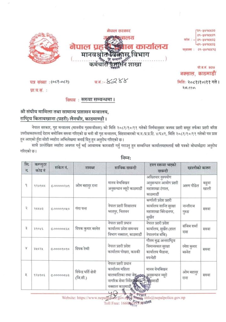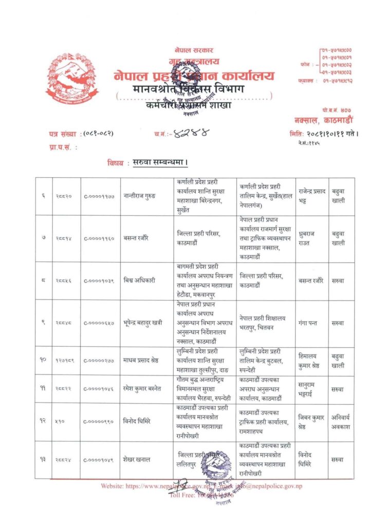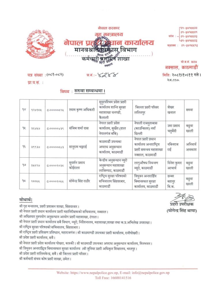 काठमाडौँ परिसरमा कार्यरत वसन्त रजौरेलाई प्रधान कार्यालय राजमार्ग सुरक्षा तथा ट्राफिक व्यवस्थापन महाशाखामा पठाइएको छ । गौतमबुद्ध अन्तर्राष्ट्रिय विमानस्थल सुरक्षा कार्यालयमा कार्यरत रमेश कुमार बस्नेतलाई काठमाडौं उपत्यका अपराध अनुसन्धान कार्यालयको जिम्मेवारी दिइएको छ। उपत्यका कार्यालयका सानुराम भट्टराईलाई प्रहरी प्रधान कार्यालयको अन्र्तारष्ट्रिय प्रहरी समन्वय महाशाखामा सरुवा गरिएको छ ।