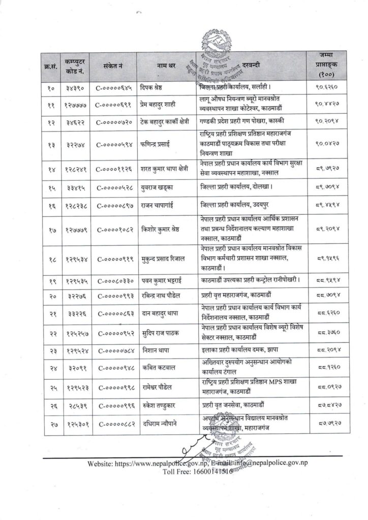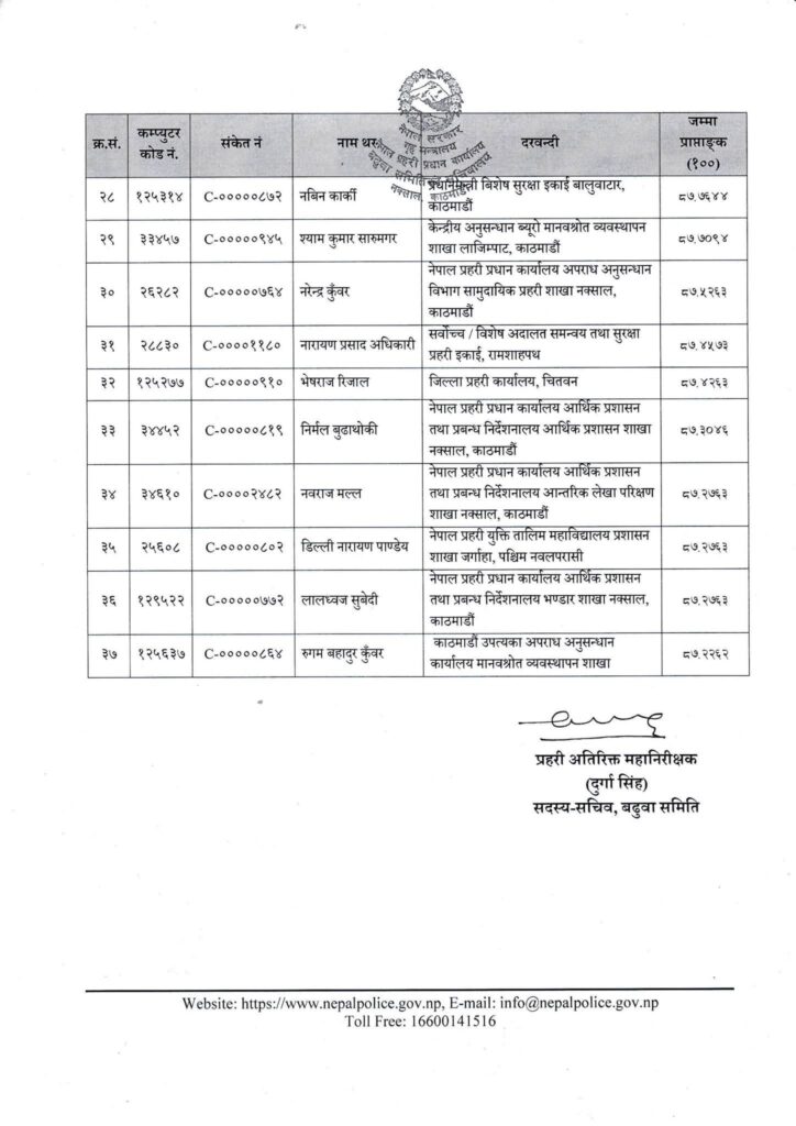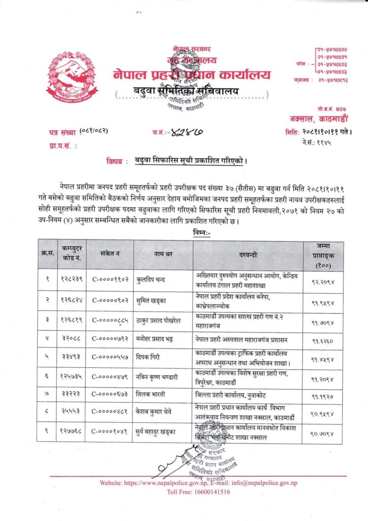 प्रहरी नियमावली २०७१ (संसोधन सहित) को नियम २७ को उप-नियम (४) को प्रावधानअनुसार मध्यरातमा प्रकाशित सूचीमा कुलदिप चन्द, सुमित खड्का, ठाकुर प्रसाद पोखरेल, मनोहर प्रसाद भट्ट, डिल्ली नारायण पाण्डेय, भेषराज रिजाल, दीपक श्रेष्ठ लगायत बढुवा सिफारिस भएका छन् ।