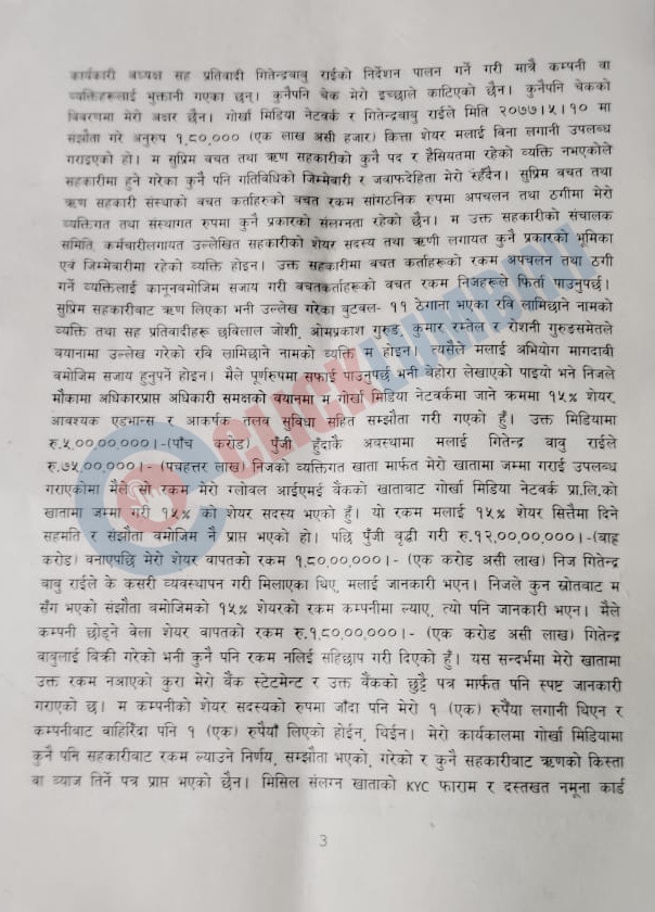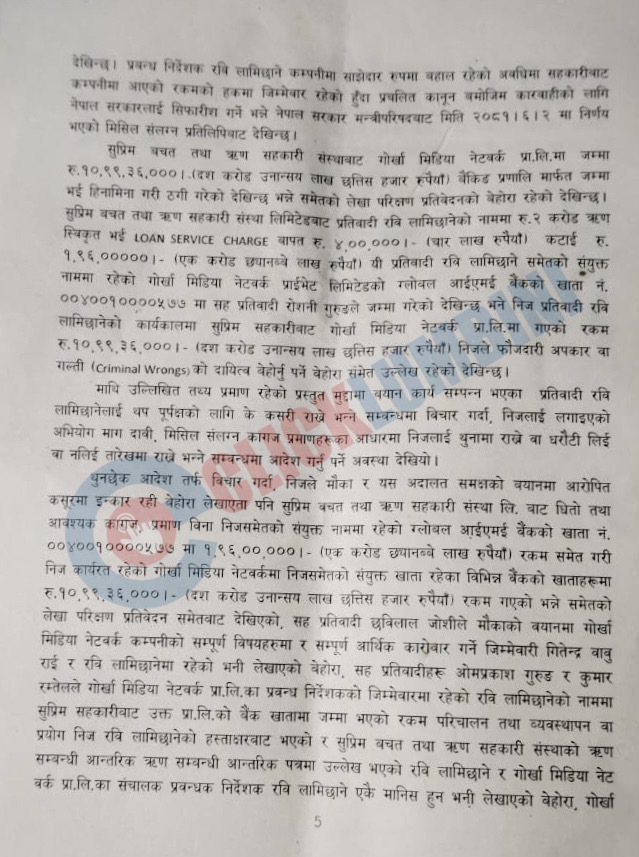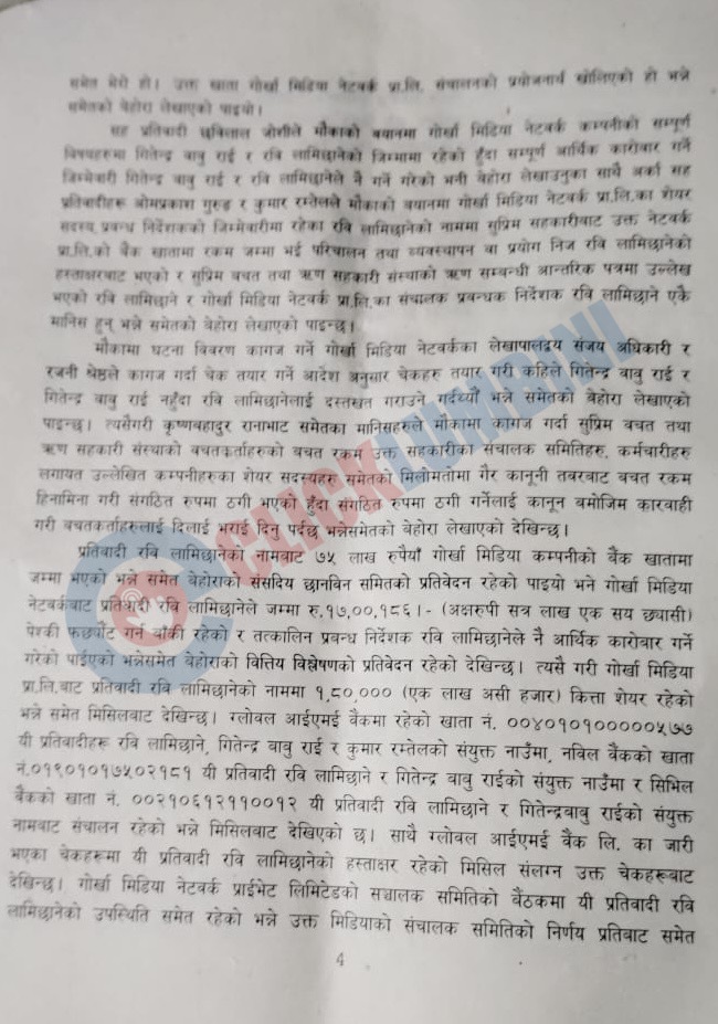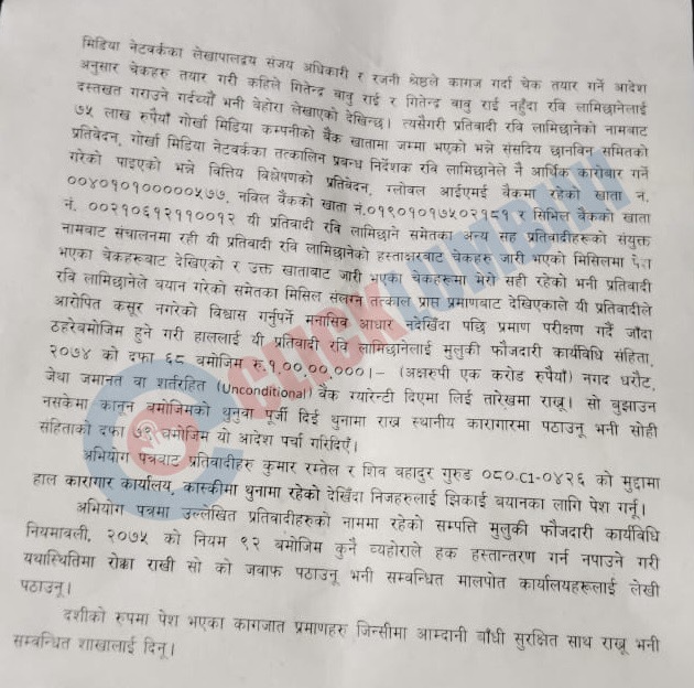 ‘गोर्खा मिडिया नेटवर्कका तत्कालीन प्रबन्ध निर्देशक रवि लामिछानेले नै आर्थिक कारोबार गर्ने गरेको पाइएको भन्ने वित्तीय विश्लेषणको प्रतिवेदन ग्लोबल आइएमई बैंकमा रहेको खाता न. ००४०१०१०००००५७७, नविल बैंकको खाता नं.०१९०१०१७५०२१८१ र सिभिल बैंकको खाता नं. ००२१०६१२११००१२ यी प्रतिवादी रवि लामिछाने समेतका अन्य सह प्रतिवादीहरूको संयुक्त नामबाट सञ्चालनमा रही यी प्रतिवादी रवि लामिछानेको हस्ताक्षरबाट चेकहरू जारी भएको मिसिलमा पैन भएको चेकहरूबाट देखिएको र उक्त खाताबाट जारी भएका चेकहरूमा मेरो सही रहेको भनी प्रतिवादी रवि लामिछानेले बयान गरेको समेतका मिसिल संलग्न तत्काल प्राप्त प्रमाणबाट देखिएकाले यी प्रतिवादीले आरोपित कसूर नगरेको विश्वास गर्नुपर्ने मनासिव आधार नदेखिँदा पछि प्रमाण परीक्षण गर्दै जाँदा ठहरेबमोजिम हुने गरी हाललाई यी प्रतिवादी रवि लामिछानेलाई मुलुकी फौजदारी कार्यविधि संहिता, २०७४ को दफा ६८ बमोजिम रु.१,००,००,०००।- (अक्षरुपी एक करोड रुपैयाँ) नगद धरौट जेथा जमानत वा शर्तरहित (Unconditional) बैंक ग्यारेन्टी दिएमा लिई तारेखमा राख्नू,’ आदेशमा भनिएको छ।