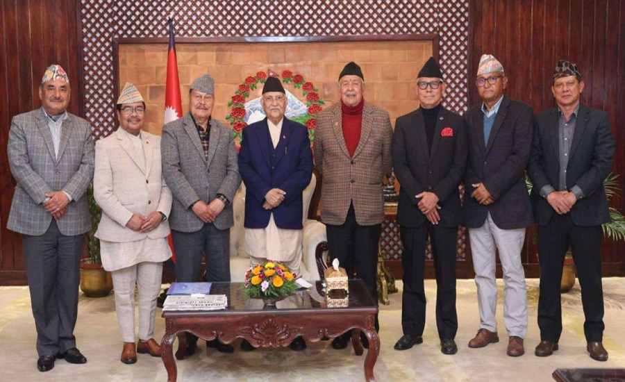 काठमाडौं, २ फागुन । प्रधानमन्त्री केपी शर्मा ओली र नेपाल प्रहरीका पूर्वप्रहरी महानिरीक्षक (आईजीपी)हरुको भेटवार्ता भएको छ । भेटवार्तामा पूर्वआईजीपीहरुले प्रस्तावित प्रहरी ऐनमा उल्लेख भएका केही बुँदाहरु सच्याउनुपर्ने माग गरेका छन् । बिहीबार साँझ प्रधानमन्त्री ओलीलाई भेट्दै पूर्वआईजीपीहरुको समूहले विवादित केही बुँदाहरु हटाउनुपर्ने माग राखेका हुन् ।