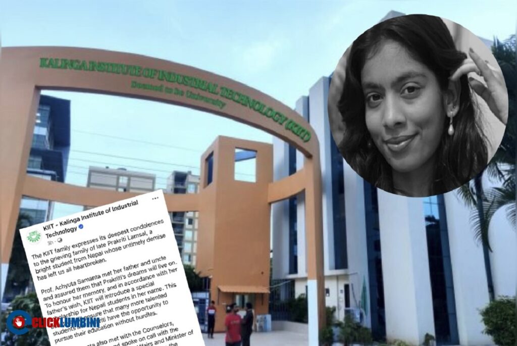 भैरहवा, ८ फागुन । भारतको ओडिसा राज्यको भुवनेश्वरस्थित कलिंगा इन्स्टिच्यूट अफ् इन्डस्ट्रियल टेक्नोलोजी (केआईआईटी) ले स्वर्गीय प्रकृति लम्सालको नाममा विशेष छात्रवृत्ति प्रदान गर्ने जनाएको छ ।