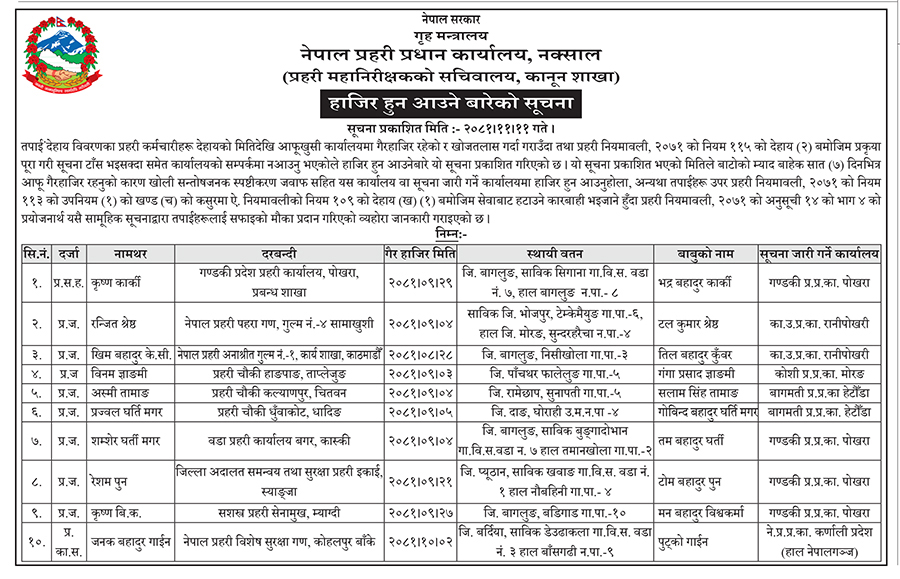 कार्यालयमा गैर हाजिर रहेको र प्रक्रिया बमोजिम खोजतलास गर्दा समेत कार्यालयको सम्पर्कमा नआएकोले सात दिन भित्र स्पष्टीकरण सहित कार्यालयमा उपस्थित हुन सम्पर्कबिहीन भएका प्रहरी कर्मचारीहरुलाई सूचित गरिएको छ ।