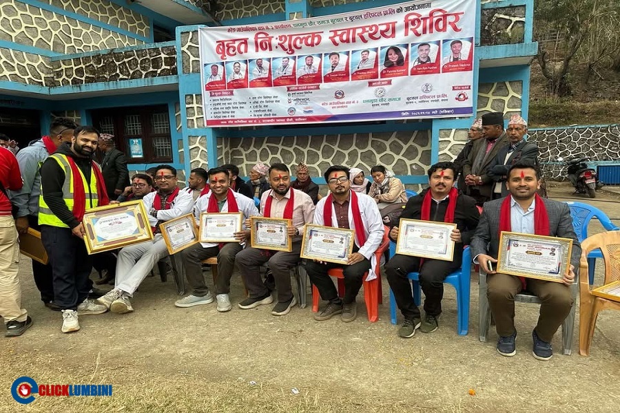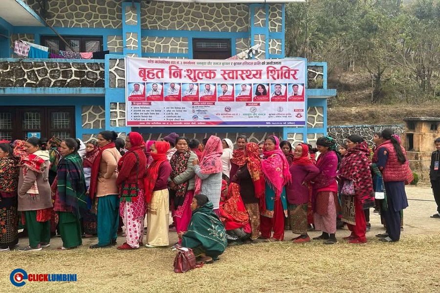 बुटवल, २६ फागुन। रुपन्देहीको बुटवलस्थित बुटवल हस्पिटल प्रा.लि.ले बाग्लुङको बरेङमा बृहत निःशुल्क स्वास्थ्य शिविर गरेको छ। बरेङ गाउँपालिका-३ बाटाकाचौर नयाँ बजार स्वास्थ्य चौकीमा आयोजना गरिएको निःशुल्क स्वास्थ्य शिविरमा ६ सय बढी स्थानीय लाभान्वित भएको बुटवल हस्पिटलले जनाएको छ। शिविरमा विशेषज्ञ चिकित्सकहरुसँगै ल्याब सेवा तथा औषधी समेत उपलब्ध गराइएको थियो।