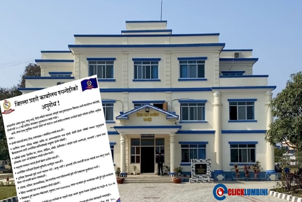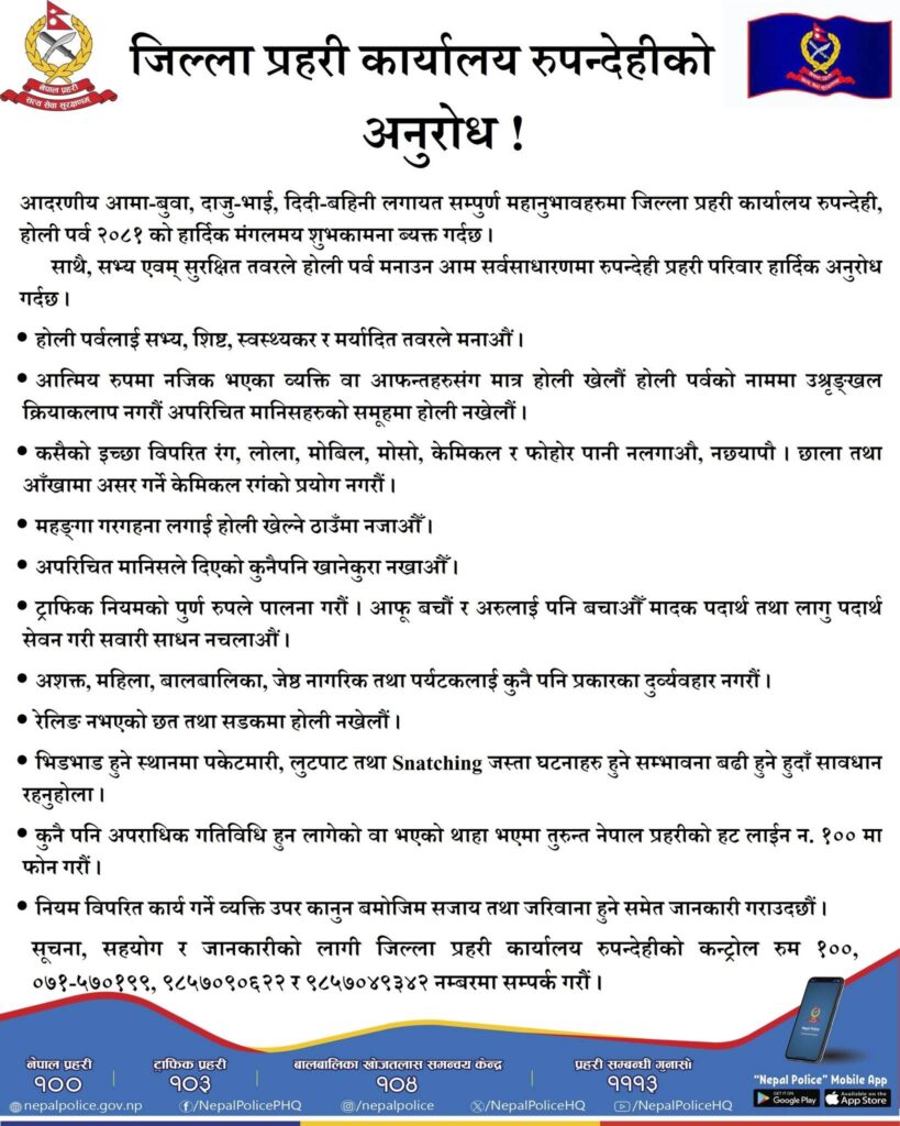 कसैको इच्छा विपरीत लोला हान्ने, रङ लगाउने, ट्राफिक नियमको उल्लंघन, मादक पदार्थ सेवन गरेर होहल्ला, झैझगडा नगर्न, मंहगा गहना लगाएर होली खेल्न स्थानमा नजान लगायत रुपन्देही प्रहरीले आग्रह गरेको छ। साथै, प्रहरीले कुनै समस्या परेमा वा अपराधिक गतिविधि हुन लागेको वा थाहा भएमा जिल्ला प्रहरी कार्यालयको कन्ट्रोल रुमको १००, ०७१५७०१९९, ९८५७०९०६२२, ९८५७०४९३४२ नम्बरमा सम्पर्क गर्न आग्रह समेत गरेको छ।