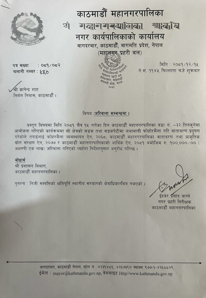 काठमाडौं महानगरपालिकाले शुक्रबार तीनकुने क्षेत्रमा पुर्याएको क्षति मूल्यांकन गरेर विभिन्न शीर्षकमा जरिवाना तोकेर निर्मल निवासलाई पत्र काटेको हो।