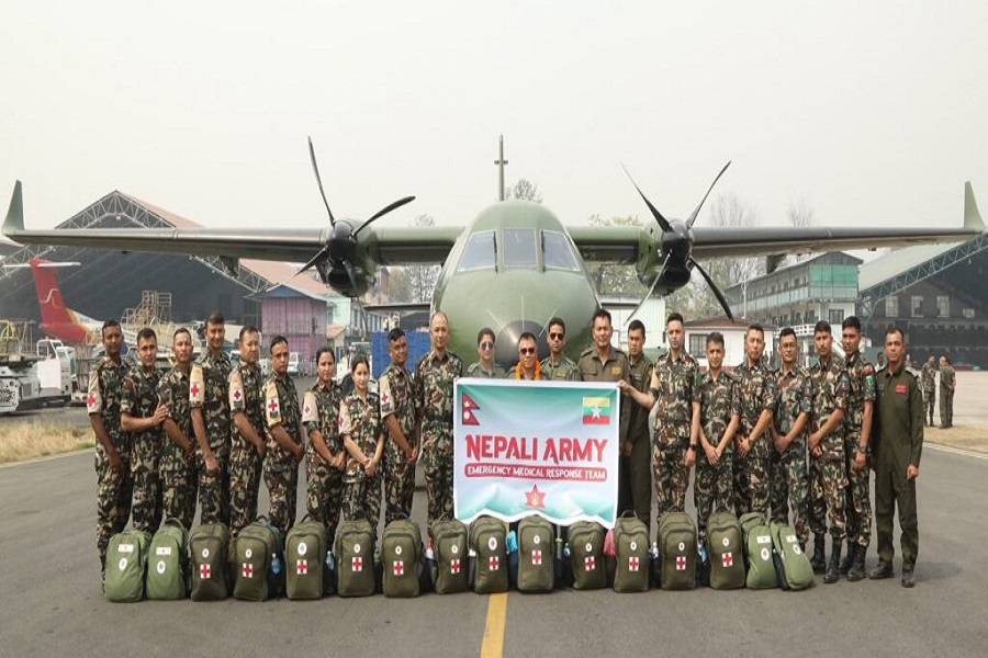 प्रमुख सेनानी रामचन्द्र श्रेष्ठको नेतृत्वमा १२ जना चिकित्सकीय टिम, ४ जना बन्दोबस्ती सहायता टिम र ६ जना ‘क्रु मेम्बर’सहित कुल २२ सदस्यीय टोली नेपाली सेनाको सिएन २३५ सिएएकए विमानद्वारा म्यानमार गएका हुन्।
