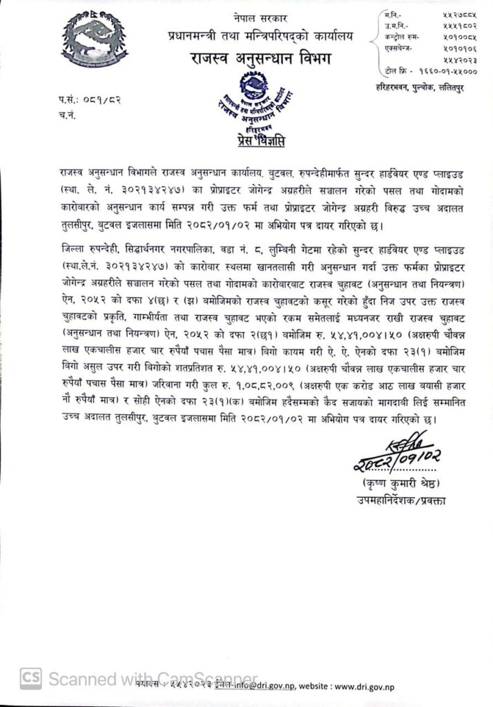 भैरहवा,२ बैशाख । राजस्व अनुसन्धान कार्यालय बुटवलले राजस्व छलीको कसुरमा भैरहवाको सुन्दर हार्डवेयर एण्ड प्लाइउडका संचालक जोगेन्द्र अग्रहरी तथा उक्त फर्मविरुद्ध उच्च अदालत तुलसीपुर बुटवल इजलासमा मुद्दा दायर गरेको छ।