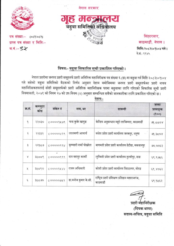 प्रहरी नियमावली, २०७१ को उपनियम २७ को उपनियम (४) अनुसार उनीहरुलाई एआइजी पदका लागि बढुवा सिफारिस गरिएको गृह मन्त्रालयले जनाएको छ ।