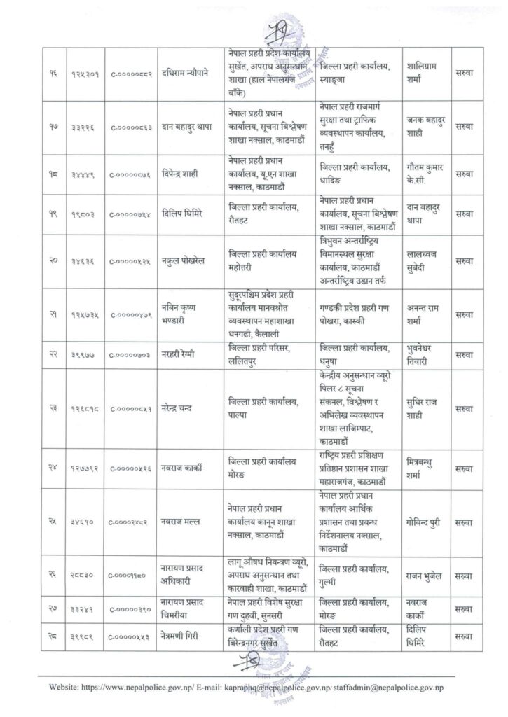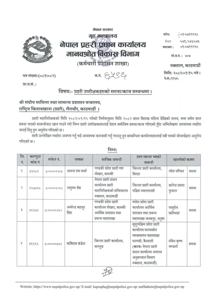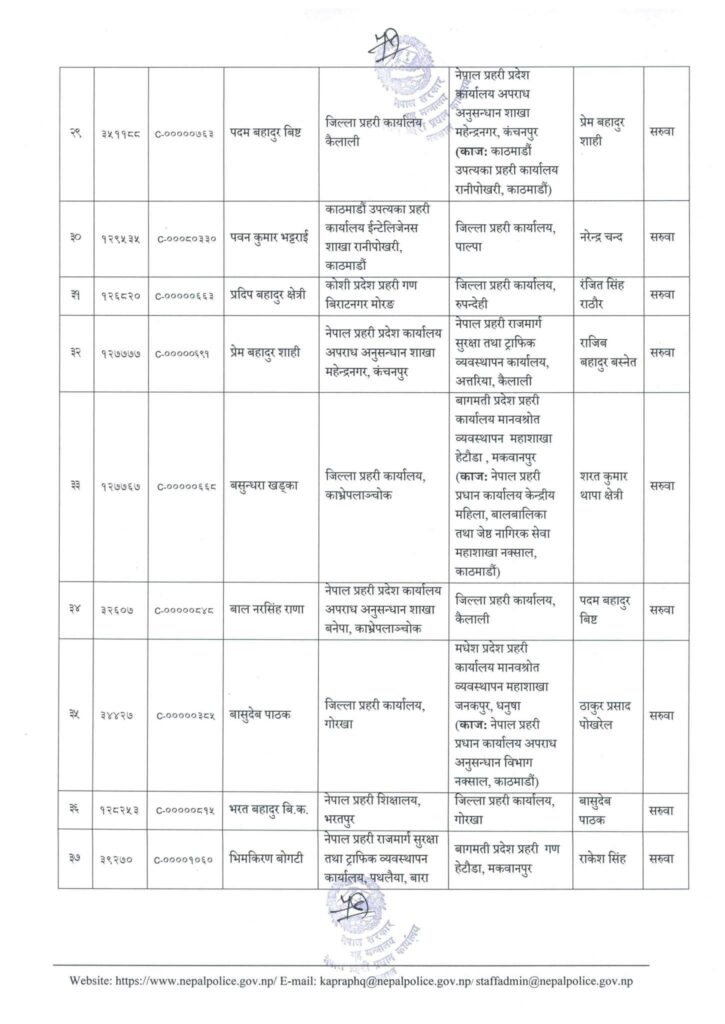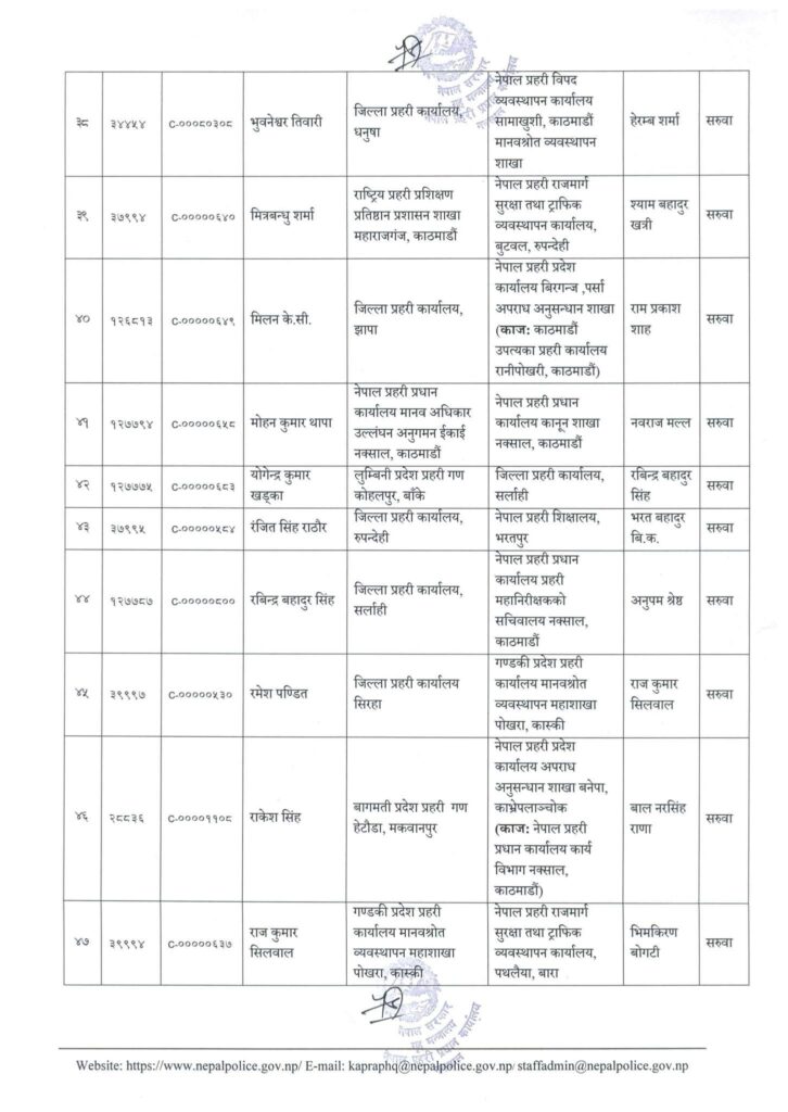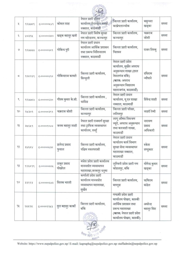 त्यस्तै एसपी खड्गबहादुर खत्रीलाई जिल्ला प्रहरी कंचनपुर, मित्रबन्धु शर्मालाई नेपाल प्रहरी राजमार्ग सुरक्षा तथा ट्राफिक व्यवस्थापन कार्यालय बुटवल, अनुपम श्रेष्ठलाई जिल्ला प्रहरी कार्यालय पश्चिम नवलपरासी, गोविन्द पुरीलाई जिल्ला प्रहरी कार्यालय चितवनको जिम्मेवारी दिईएको छ।