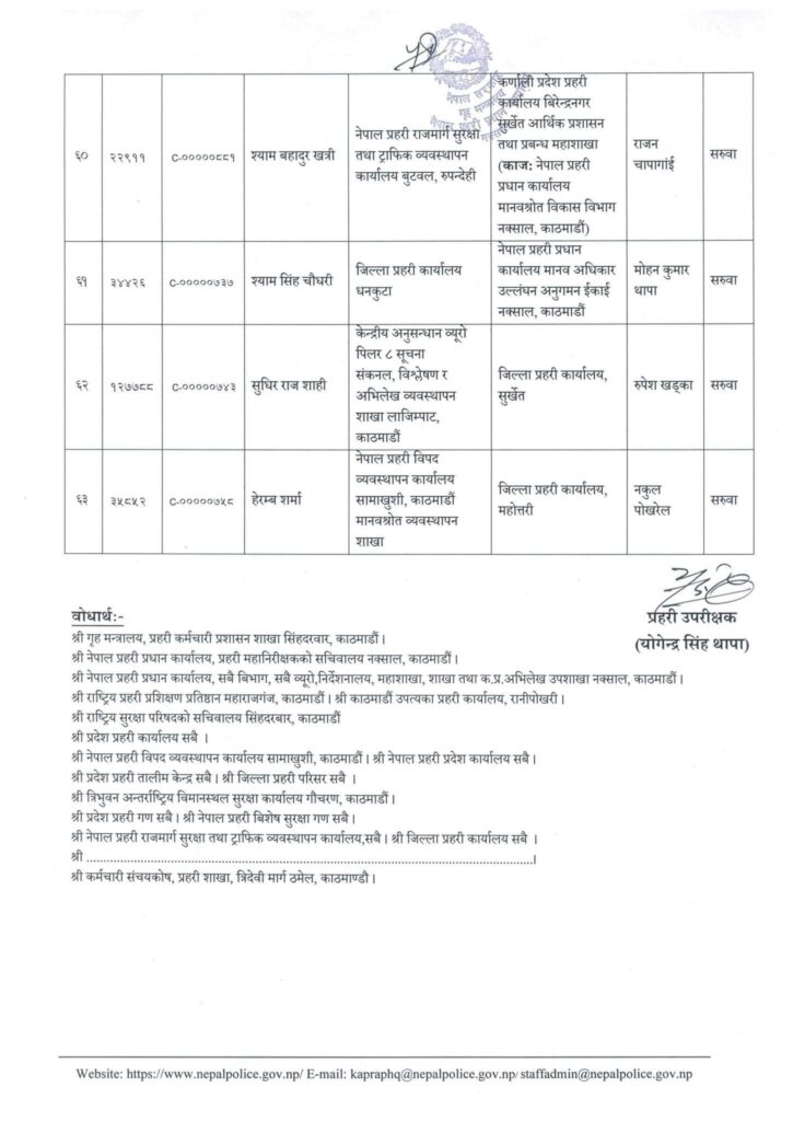 भैरहवा,१४बैशाख। नेपाल प्रहरीका ६३ जना प्रहरी उपरीक्षक (एसपी) हरुको सरुवा भएको छ। प्रहरी महानिरीक्षकस्तरीय निर्णयले सोमबार उनीहरुको सरुवा/काज भएको हो।