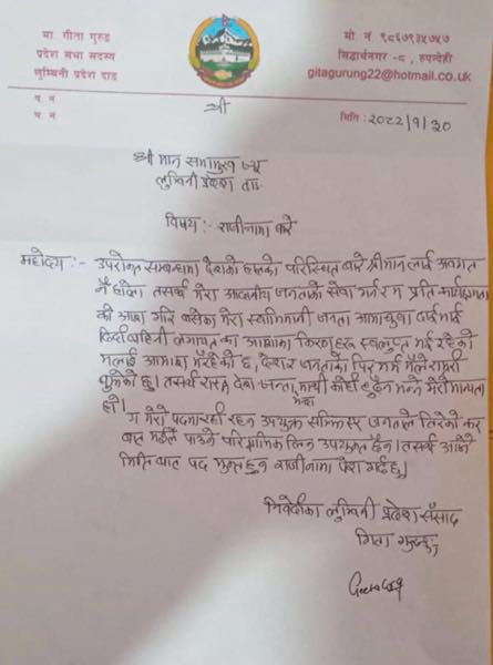 दाङ,३०बैशाख। लुम्बिनी प्रदेशसभाको सांसद गीता गुरुङले जनताका आशाका किरणहरु स्वलुप्त भइरहेको भन्दै पदबाट राजीनामा दिएकी छन्।