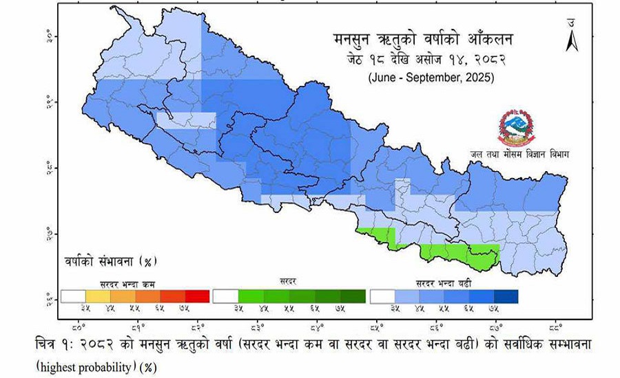 विभागका वरिष्ठ मौसमविद् विभूति पोख्रेलका अनुसार यस वर्षको मनसुन अवधिमा सरदरभन्दा बढी वर्षा र गर्मी हुनेछ। उनले देशभरका स्थानअनुसार ५५ देखि ६५ प्रतिशत, ४५ देखि ५५ प्रतिशत र ३५ देखि ४५ प्रतिशत वर्षा हुने सम्भावना रहेको बताइन्।