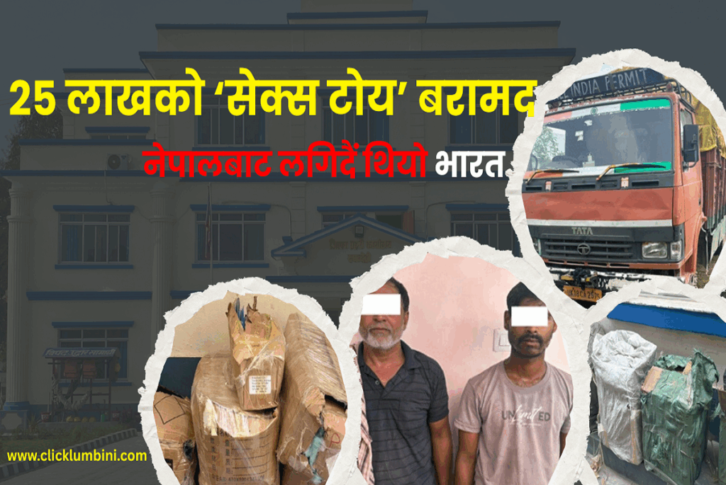 मंगलबार ओमसतिया गाउँपालिका-४ बाईपासस्थित चेकजाँच गर्ने क्रममा यूके १८ सिए २५७५ नम्बरको ट्रकमा माथिल्लो भागमा लुकाएर राखिएको २४ लाख ४५ हजार मूल्य बराबरको सेक्स टोय बरामद भएको जिल्ला प्रहरी कार्यालय रुपन्देहीका डीएसपी गणेश सापकोटाले बताए।