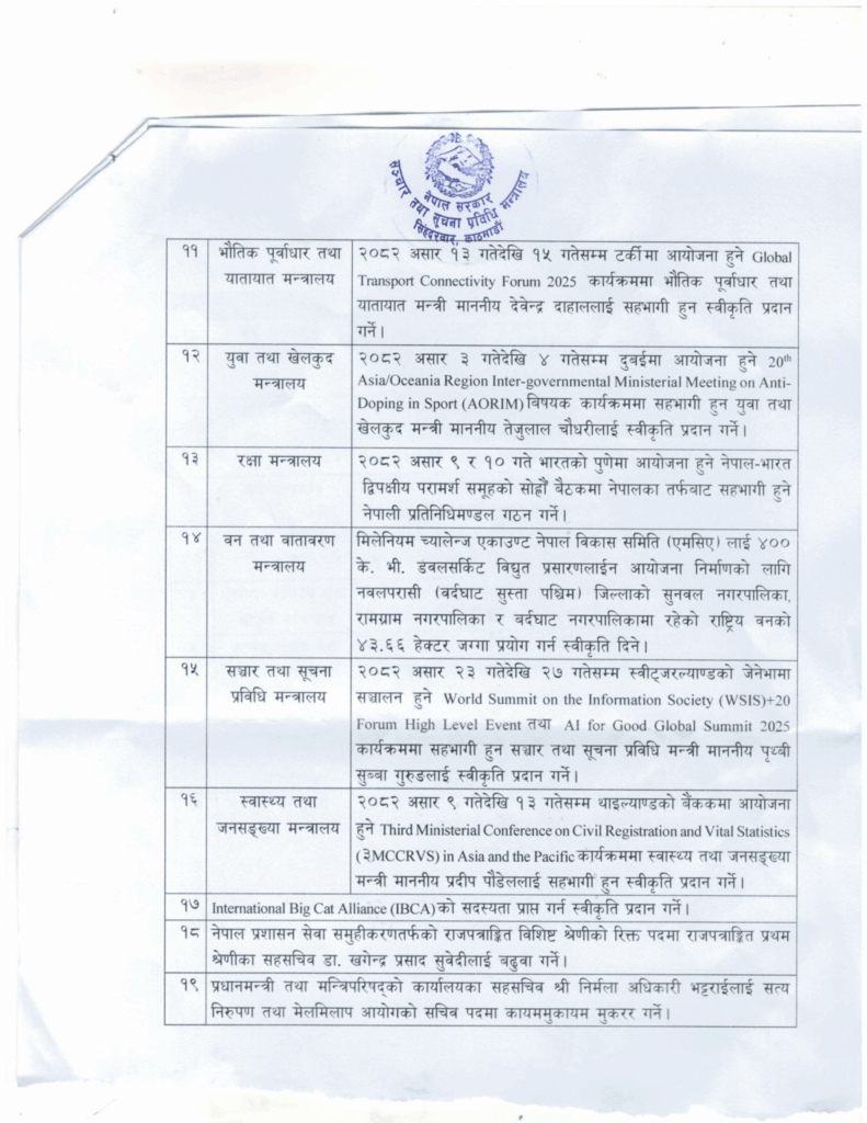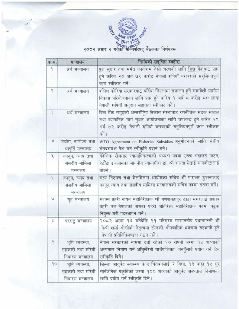 काठमाडौं,४असार। सरकारले मन्त्रिपरिषद् बैठकका निर्णय सार्वजनिक गरेको छ।