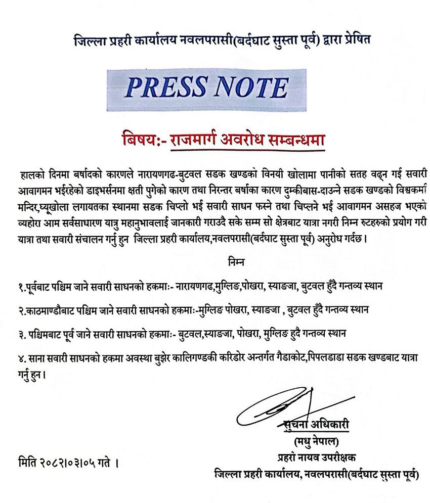 त्यस्तै, बाटो चिप्लो र हिलो भएका कारण सवारी साधन फस्ने समस्या समेत देखिएको छ। यस अवस्थालाई मध्यनजर गर्दै जिल्ला प्रहरी कार्यालय, नवलपरासी (बर्दघाट–सुस्ता पूर्व) ले बिहीबार सूचना जारी गर्दै यात्रुहरुलाई वैकल्पिक मार्ग प्रयोग गर्न आग्रह गरेको हो।