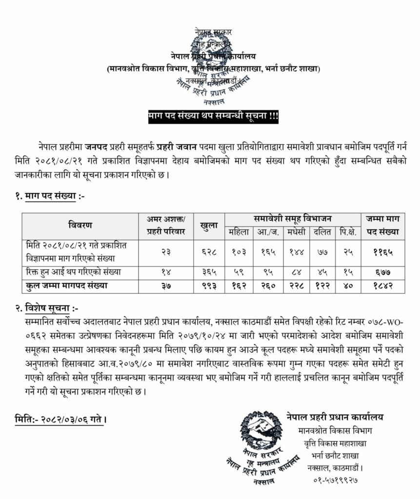 प्रहरी प्रधान कार्यालय, मानवस्रोत विकास विभागले एक सूचना जारी गर्दै सर्वोच्च अदालतको आदेश कार्यान्वयन गर्नका लागि पहिले माग गरिएको १ हजार १६५ पदमा थप ६७७ पद थप गर्ने निर्णय गरिएको जानकारी दिएको हो।