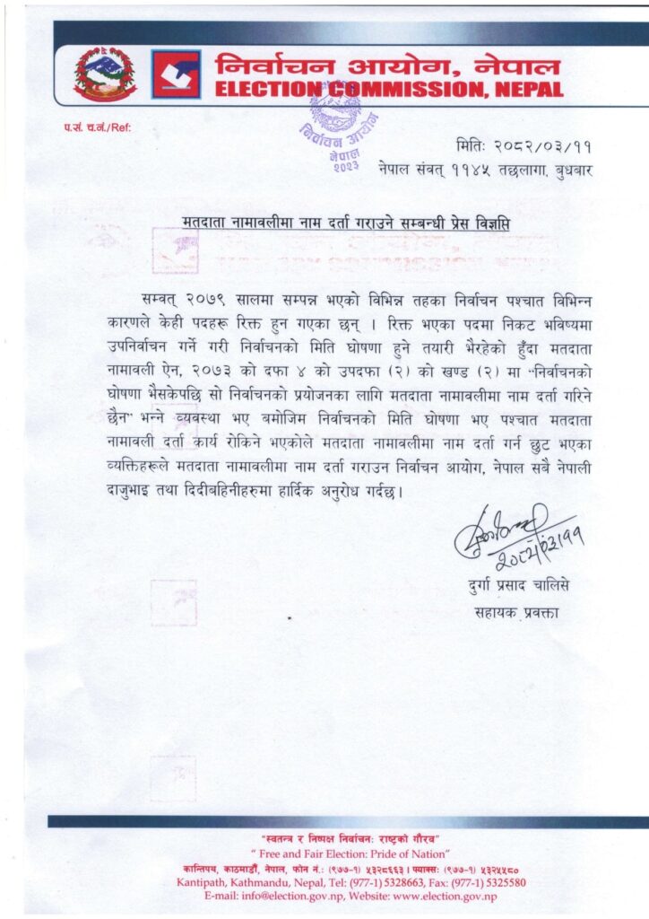 आयोगका सहायक प्रवक्ता दुर्गाप्रसाद चालिसेले भने, “निर्वाचनको मिति घोषणा भइसकेपछि नाम दर्ता गर्न मिल्दैन। त्यसैले यथाशीघ्र आफ्नो नाम दर्ता गराउन अनुरोध गर्दछौं।”