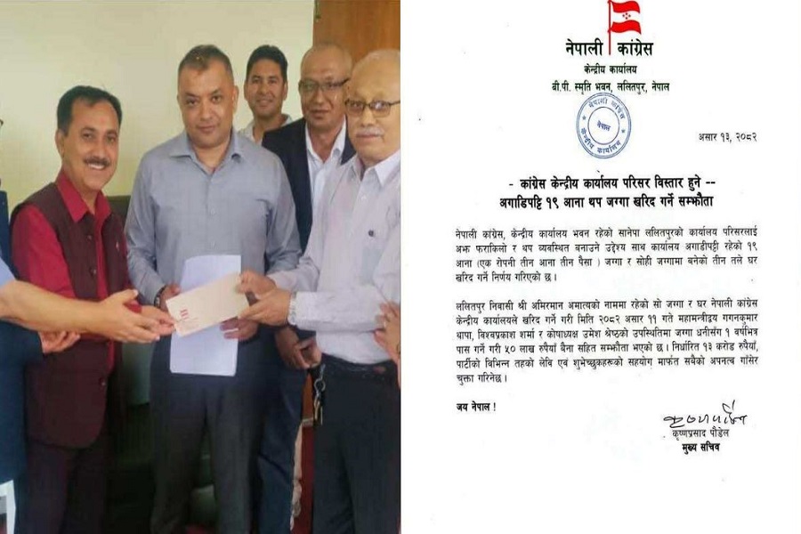 पार्टीका महामन्त्रीद्वय गगनकुमार थापा, विश्वप्रकाश शर्मा र कोषाध्यक्ष उमेश श्रेष्ठको उपस्थितिमा जग्गा धनीसँग १ वर्षभित्र पास गर्ने गरी ५० लाख रुपैयाँ बैनासहित सम्झौता भएको कांग्रेसले जनाएको छ।