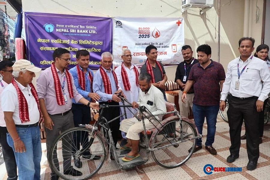 भैरहवा,२३ असार। नेपाल एसबिआई बैंक लिमिटेड लुम्बिनी प्रदेश कार्यालय, भैरहवाले ह्वील चेयर वितरण र रक्तदान र कार्यक्रम गरेको छ। बैंकको ३२ औं वार्षिकोत्सवको अवसरमा सोमबार भैरहवा शाखा कार्यालयले बैंक परिसरमा उक्त कार्यक्रम गरेको हो।