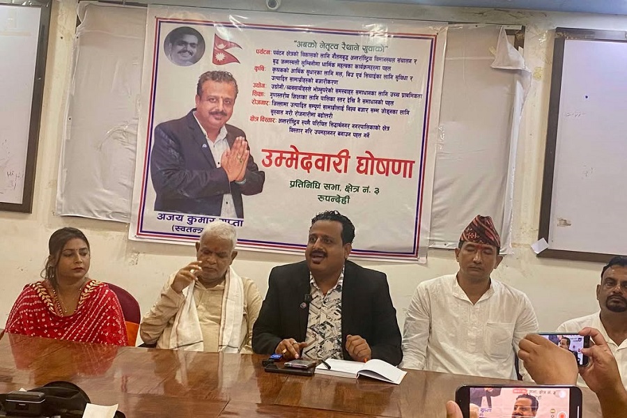 भैरहवा,२६असार। रुपन्देही क्षेत्र नम्बर–३ को उपनिर्वाचनका लागि भैरहवाका उद्योगी अजय कुमार गुप्ताले प्रतिनिधिसभा सदस्य पदमा उम्मेदवारीको घोषणा गरेका छन्।