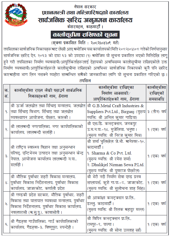 कार्यालयले शुक्रवार एक सूचना जारी गर्दै विभिन्न निकायहरुको सिफारिसमा ती निर्माण व्यवसायी र आपूर्तिकर्तालाई कालोसूचीमा राखिएको जनाएको छ।
