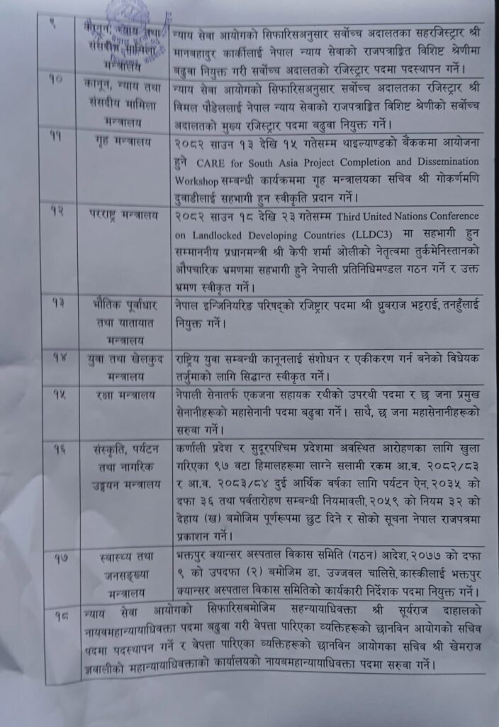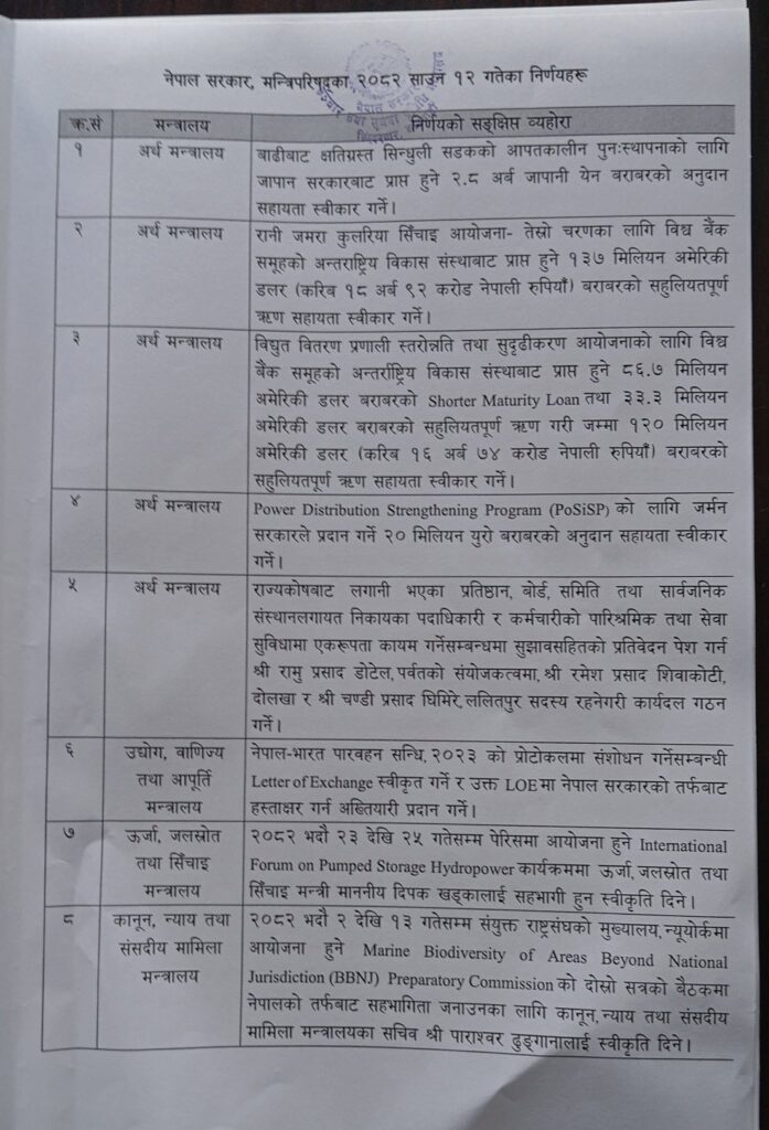 काठमाडौं,१५ साउन। सरकारले मन्त्रिपरिषद् बैठकका निर्णय सार्वजनिक गरेको छ।