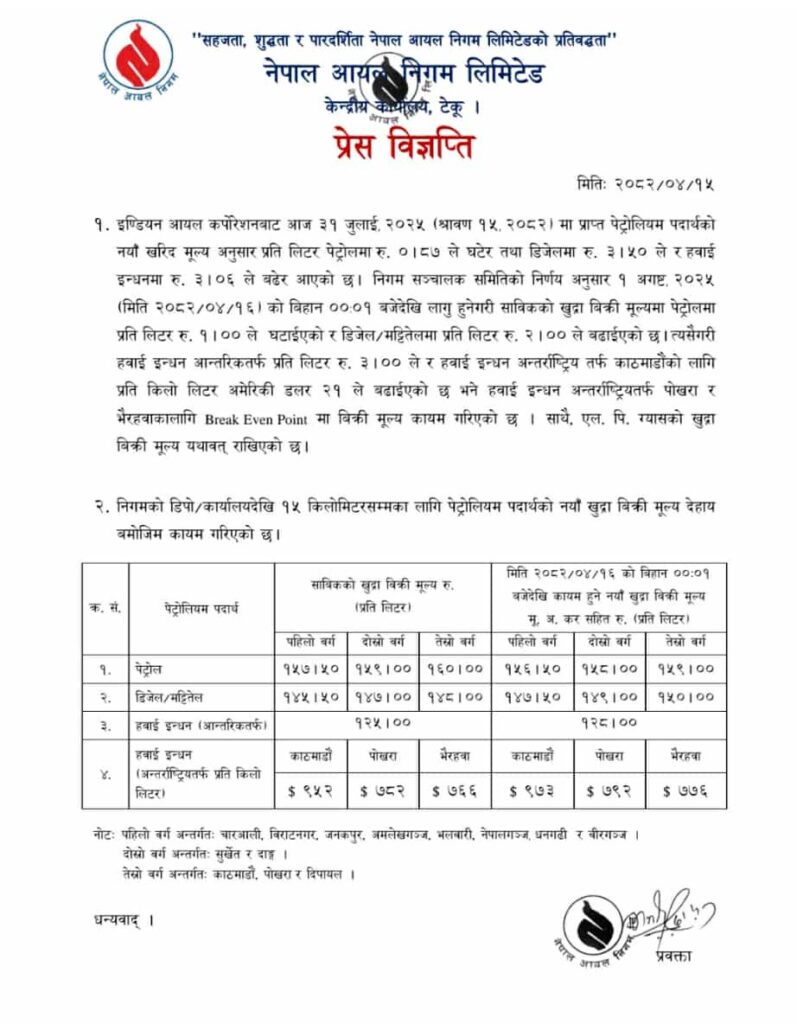 त्यस्तै हवाई इन्धनको आन्तरिकतर्फ ३ रुपैयाँले मूल्य वृद्धि गरिएको छ। अन्तर्राष्ट्रियतर्फ काठमाडौंका लागि प्रति किलोलिटर २१ अमेरिकी डलरले वृद्धि भएको निगमले जनाएको छ।