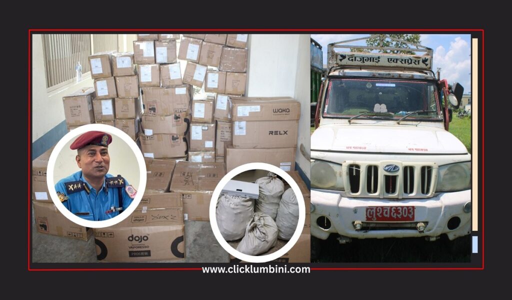 बिल बिजक विना राजस्व छलीको सामग्री ओसारपसार भइरहेको प्राप्त सूचनाका आधारमा लु २ च ६३०३ नम्बरको गाडी चेकजाँच गर्दा १ करोड ७१ लख २५ हजार मूल्य बराबरको बिल बिजक नभएको विद्युतीय भेप लगायतका सामग्री नियन्त्रणमा लिइएको रुपन्देहीका एसपी प्रदीप बहादुर क्षेत्रीले बताए।
