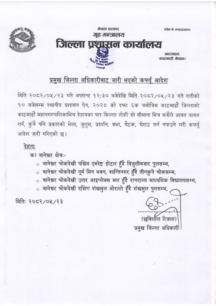 काठमाडौं,२३ भदौ ।जिल्ला प्रशासन कार्यालय काठमाडौंले बानेश्वर क्षेत्रमा कर्फ्यु आदेश जारी गरेको छ। जेनजी पुस्ताको प्रदर्शन नियन्त्रण बाहिर गएपछि प्रशासनले कर्फ्यु आदेश जारी गरेको हो।
