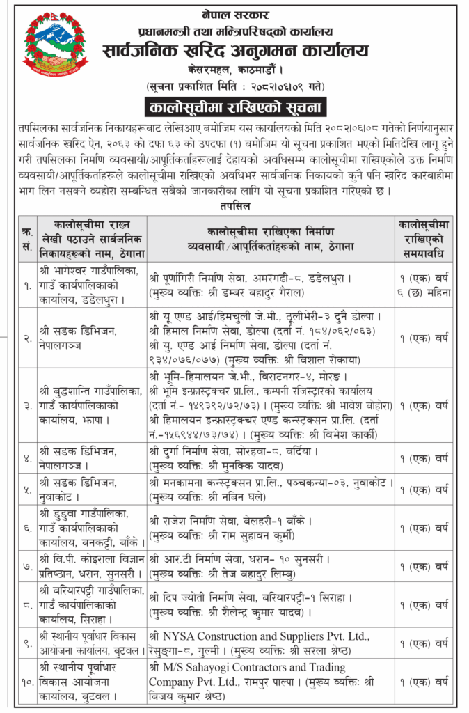 सार्वजनिक निकायबाट लेखी आएबमोजिम सार्वजनिक खरिद ऐन, २०६३ को दफा ६३ को उपदफा (१) बमोजिम सूचना प्रकाशित भएको मितिदेखि लागु हुने गरी कालोसूचीमा राखिएको सूचनामा उल्लेख छ।