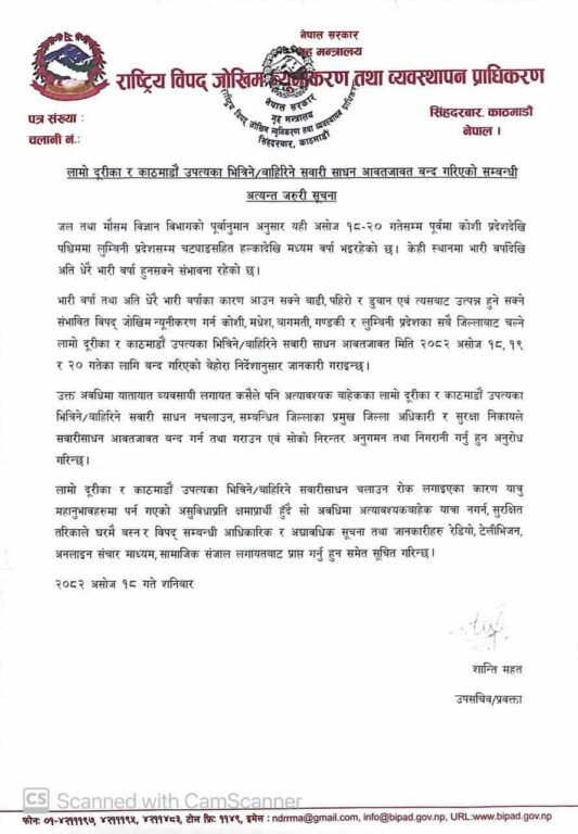 कोशी, मधेश, बागमती, गण्डकी र लुम्बिनी प्रदेशका सबै जिल्लाबाट चल्ने लामो दूरीका र काठमाडौँ उपत्यका भित्रिने र बाहिरिने सवारी साधन असोज १८, १९ र २० गतेका लागि आवातजावत बन्द गरिएको प्राधिकरणले जनाएको छ।