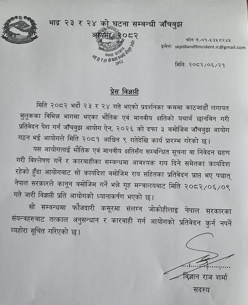 आयोगका सदस्य विज्ञानराज शर्माले जारी गरेको विज्ञप्तिमा फौजदारी कसूरमा संलग्न जो कोहीलाई नेपाल सरकारका संयन्त्रहरुबाट तत्काल अनुसन्धान र कारबाही गर्न आयोगको प्रतिवेदन कुर्न नपर्ने उल्लेख छ।
