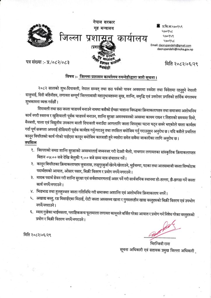 जिल्ला प्रशासन कार्यालय रुपन्देहीका सूचना अधिकारी एवं सहायक प्रमुख जिल्ला अधिकारी चिरन्जिवी रानाले जारी गरेको सूचनामा पर्वमा जुवातास नखेल्न, पटक तथा आतसबाजी जस्ता विष्फोटक पदार्थहरुको आयात, ओसरपसार, विक्रीवितरण र प्रयोग नगर्न उल्लेख छ ।