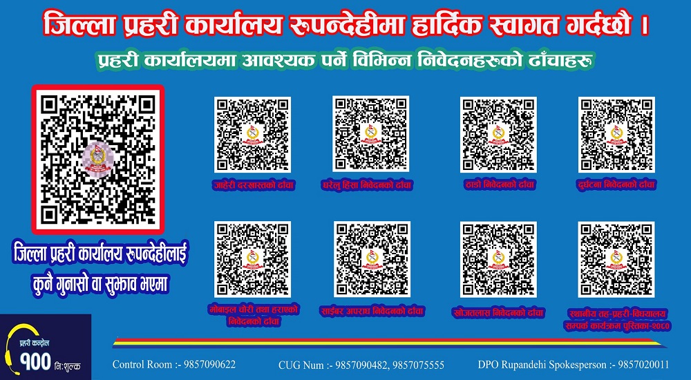 कार्यालयले जिल्ला प्रहरी कार्यालय रुपन्देहीलाई कुनै गुनासो वा सुझाव भएमा, जाहेरी दरखास्त, घरेलु हिंसा निवेदन, ठाडो निवेदन, दुर्घटना निवेदन, मोबाइल चोरी तथा हराएको निवेदन, साईबर अपराध निवेदन, खोजतलास निवेदन र स्थानीय तह-प्रहरी-विधालय सम्पर्क कार्यक्रम पुस्तिका-२०८० को निवेदनको ढाँचाको ‘क्यूआर कोड’ टाँस गरिएको जनाएको छ ।