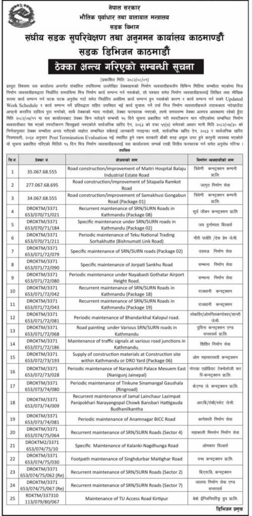 सडक डिभिजन काठमाडौं अन्तर्गत संघीय सडक सुपरिवेक्षण तथा अनुगमन कार्यालय काठमाडौंले सूचना जारी गर्दै तोकिएको समयभित्र निर्माण सम्पन्न नगर्ने २५ वटा निर्माण कम्पनीसँगको ठेक्का तोडिएको हो।