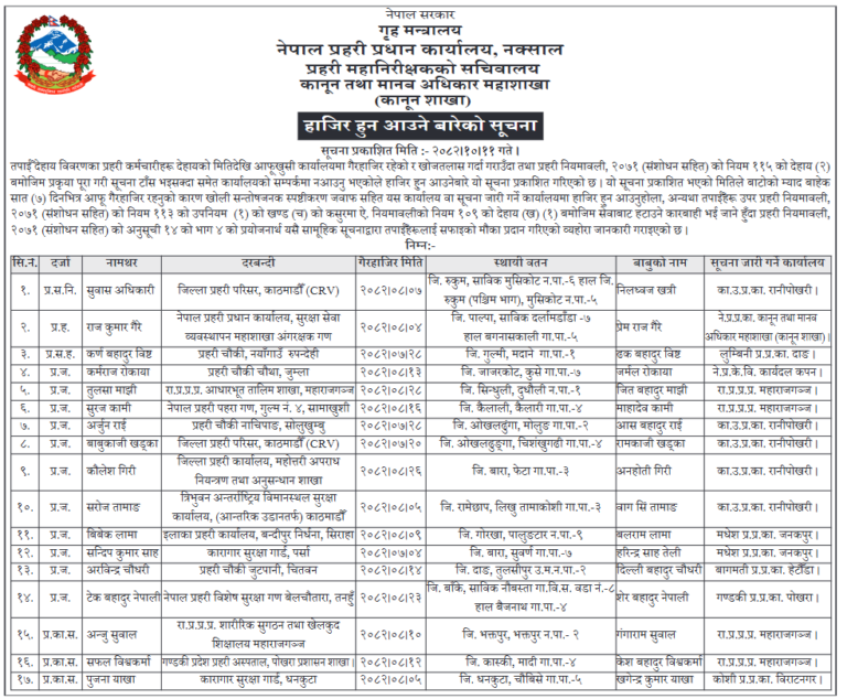 कार्यालयले आईतबार एक सूचना जारी गर्दै आफूखुसी गैर हाजिर रहेका प्रहरी कर्मचारीलाई सात दिनभित्र सम्पर्कमा आउन निर्देशन दिएको हो। गैर हाजिर भएकाहरुमा प्रहरी सहायक निरीक्षक, प्रहरी हबल्दार, सहायक हबल्दार १र१ जना, प्रहरी जवान ११ जना र कार्यालय सहयोगी ३ जना छन् ।