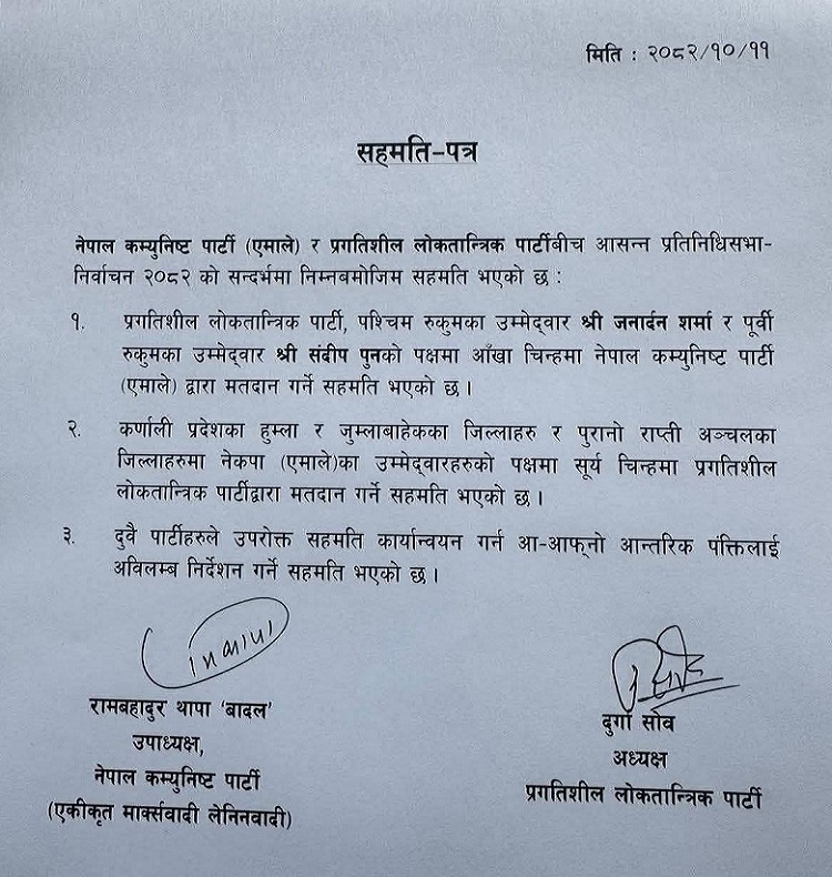 सहमति अनुसार प्रगतिशील लोकतान्त्रिक पार्टी पश्चिम रुकुममा उम्मेदवार जनार्दन शर्मा र पूर्वी रुकुमका उम्मेदवार सन्दीप पुनको पक्षमा आँखा चिन्हमा एमालेले मतदान गर्ने उल्लेख छ।
