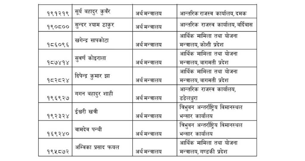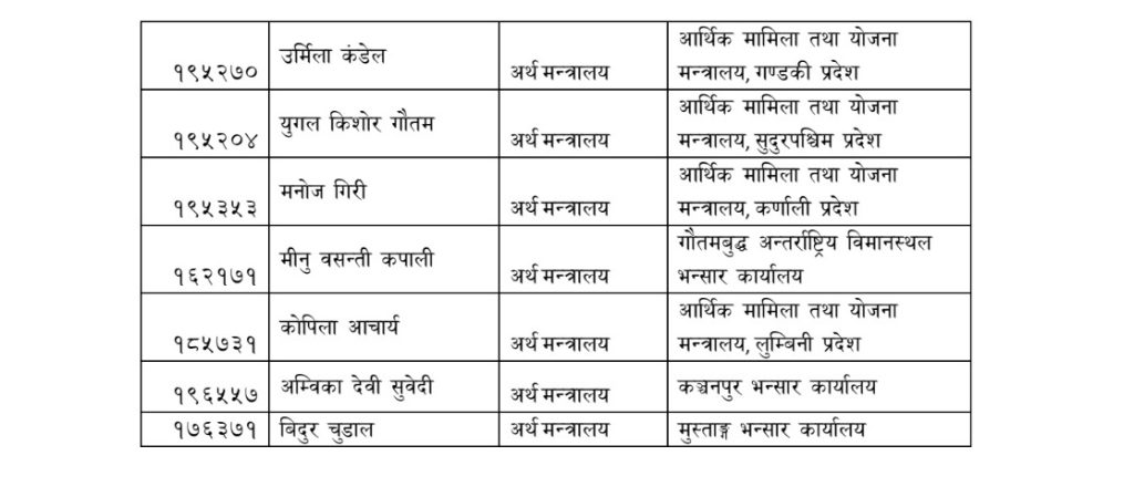 मन्त्रालयका अनुसार, उपसचिवहरूलाई भन्सार विभाग, आन्तरिक राजस्व विभाग, सम्पत्ति शुद्धीकरण विभाग, लगायत मातहतका विभिन्न निकायहरुमा सरुवा तथा पदस्थापन गरिएको हो ।
