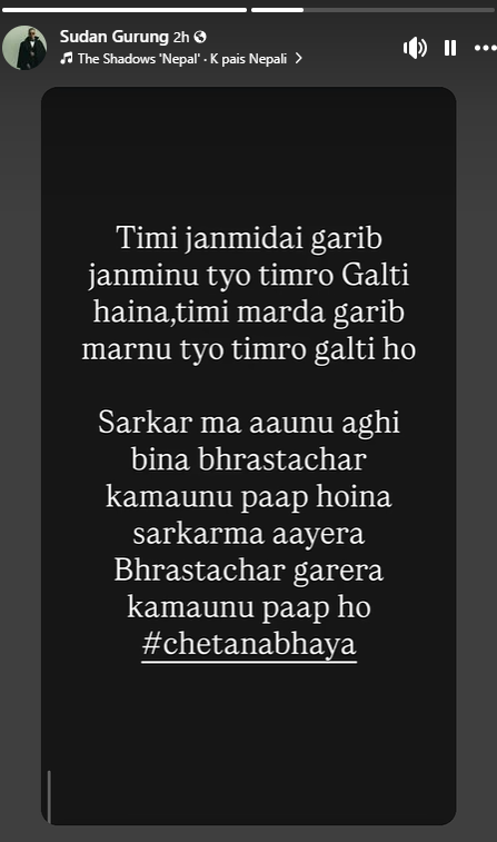 फेसबुक स्टोरीमार्फत जवाफ दिएका गृहमन्त्री गुरुङले ब्याकग्राउन्डमा गीतको बोल राखेका छन्-‘के पाइस् नेपाली केरा…।’