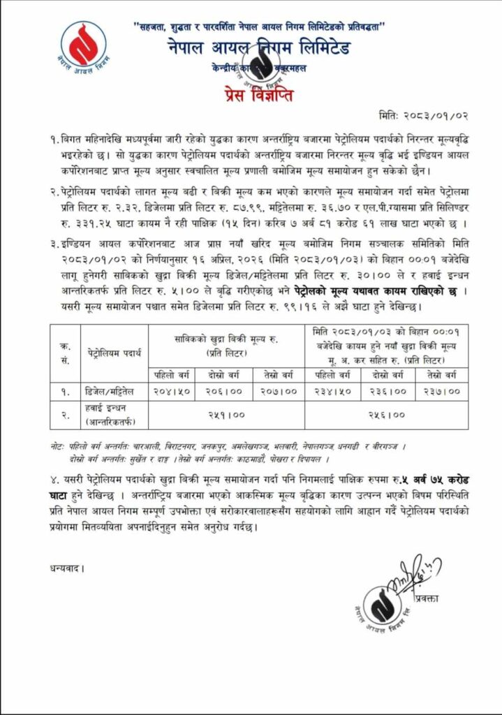 निगमका अनुसार, डिजेल र मट्टीतेल प्रतिलिटर ३० रुपैयाँले वृद्धि भएको छ । पेट्रोलको मूल्य भने यथावत राखिएको छ । त्यस्तै, आन्तरिकतर्फको हवाई मूल्य पनि प्रतिलिटर ५ रुपैयाँले वृद्धि गरिएको छ।