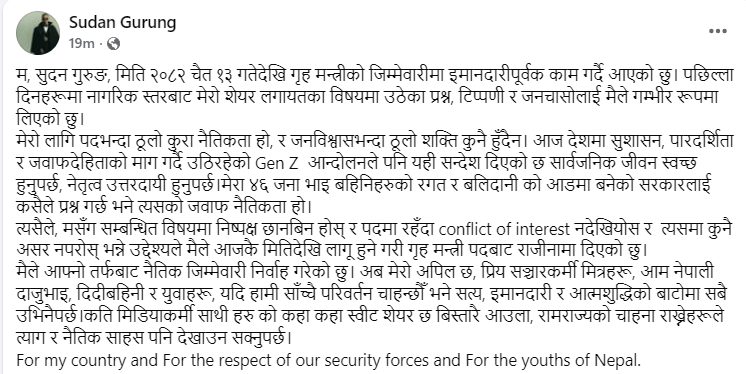 उनले भनेका छन्, ‘मसँग सम्बन्धित विषयमा निष्पक्ष छानबिन होस् र पदमा रहँदा कन्फ्लिक्ट अफ इन्ट्रेष्ट नदेखियोस् भन्ने उद्देश्यले मैले आजकै मितिदेखि लागू हुने गरी गृह मन्त्री पदबाट राजीनामा दिएको छु।’